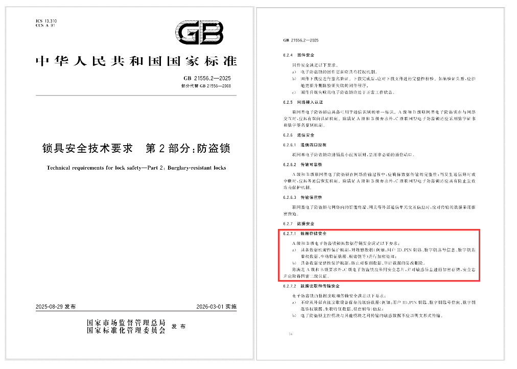 在2025年8月发布的国家标准GB 21556.2-2025《锁具安全技术要求 第2部分:防盗锁》 中,针对数据存储安全明确要求: